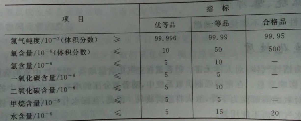 國內(nèi)高純氮?dú)猱a(chǎn)品標(biāo)準(zhǔn)1:技術(shù)指標(biāo)由于氮?dú)?/strong>產(chǎn)品生產(chǎn)方法很多,工藝及設(shè)備差異很大,產(chǎn)品質(zhì)量相當(dāng)懸殊;另外,使用要求也很大不同。國內(nèi)高純氮規(guī)定了三個(gè)等級(jí),以適應(yīng)不同應(yīng)用的需要,具體分級(jí)的技術(shù)指標(biāo)如表2